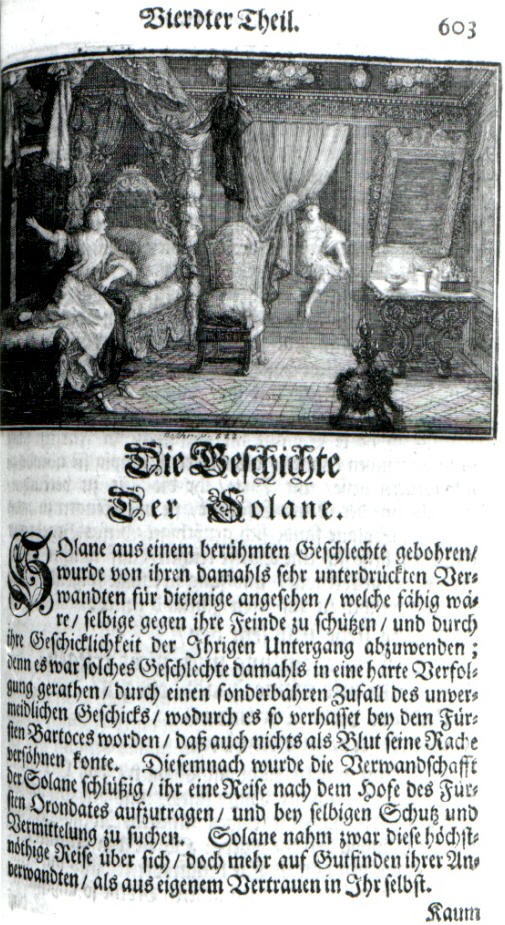 Beginn der "Geschichte der Solane" im vierten Band der zweiten Fassung der "Römischen Octavia" von 1713/14 mit einem Kupferstich eines unbekannten Künstlers. Quelle: [Anton Ulrich von Braunschweig-Wolfenbüttel:] Der Römischen Octavia Vierdter Theil. Braunschweig/ Gedruckt und verlegt durch Johann Georg Zilligern Hochfürstl. privil. Hof-Buchdrucker [1713 oder 1714], 602. - Herzog August Bibliothek Wolfenbüttel, Signatur: Xb 2246:4. Das Kupfer zeigt den Moment, in dem Orondates (August der Starke) in das Zimmer von Solane (Aurora von Königsmarck) eindringt (vgl. Römische Octavia IVb, 622-623). |