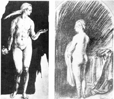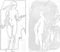 Mit Hilfe einer einfachen Umkehroperation lässt sich ein weichgezeichnetes Bild in dessen hard-edged-Version verwandeln, denn jede Filteroperation besitzt per definitionem ein Gegenteil. Wenn man daher die unscharfe von der scharfen Variante Pixel für Pixel abzieht, bleiben die Kanten übrig. Ein aus der Kunstgeschichte bekanntes Bildpaar soll das Verfahren illustrieren, die Abbildungen einer Dürer- und einer Rembrandt-Skizze aus den Kunstgeschichtlichen Grundbegriffen Heinrich Wölfflins.