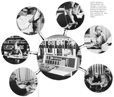 Diese Illustration stammt aus dem Buch "Kybernetik, die uns angeht", das Anfang der 70er Jahre in der Reihe "Aktuelles Wissen" erschien. Und als Legende können Sie vielleicht den hoffnungsvollen Satz entziffern: "Student, Schülerin, Wissenschaftler und Manager: sie werden in Zukunft zur Lösung ihrer Probleme bei einer Datenbank anfragen können, ohne viel Zeit für Sucharbeit aufwenden zu müssen." Ohne dieses Diagramm nun im Detail in die Geschichte oder Ikonographie von Wissensordnungen stellen zu wollen, möchte ich Sie darauf hinweisen, dass hier anscheinend eine verloren geglaubte Mitte wieder aufersteht - ein Ort der Verwaltung oder Regierung, der ununterbrochen selbst mit den unterschiedlichsten und entferntesten Provinzen in Verkehr steht, oder auch ein epistemisches Gravitationszentrum, das die verschiedensten Wissenszusammenhänge in einer stabilen Umlaufbahn hält. Und während um dieses Zentrum herum Geschäftigkeit und Leben herrscht, Menschen rauchen und telefonieren, konzentriert lernen oder angeregt diskutieren, strahlt diese Mitte eine gewisse Ruhe und Gelassenheit aus, eine Souveränität, wenn man es so nennen will. Die Maschine geht ihren Gang, und die Aufsichtsperson sieht ihr dabei zu oder liest Zeitung. Eine Nachtwache des Weltwissens.