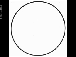 Und das Wunderbare ist, dass dieser Plattenspieler erst mal Bilder abspielt. Die erste Platte ist eine Bildplatte, aber nicht, weil ein Bild eingraviert ist, sondern weil digitale Informationen darauf enthalten sind, die als Bilder dargestellt werden sollen. Der pfiffige Außerirdische braucht nur die Platte an einem Motor zu befestigen, irgendwie zu entziffern, dass sie auf 16,6 Umdrehungen läuft, den mitgelieferten Abtastkopf aus der Zubehörbox zu nehmen und die Bilder irgendwie auszugeben. Wenn er jetzt noch das Signal für den Zeilenumbruch richtig identifiziert, bekommt er als erstes ein Testbild zu sehen, das nicht mehr sagt als dass Kommunikation kommuniziert: Er sieht einen Kreis (und bitte beachten Sie das Copyright!), der deshalb als universal durchgeht, weil Flüssigkeiten in der Schwerelosigkeit Kugeln bilden, die so rund sind wie sonst nur Kreise in Künstlerlegenden. Und das basiert natürlich auf der stillschweigenden Annahme, dass der Außerirdische schon einen Farbmonitor der um 1970 neuesten Generation hat.