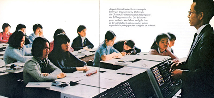 Sie sehen hier ein Diagramm, das die kybernetischen Hoffnungen auf neue Formen der Lehre illustrieren soll. Vorne soll nun nicht mehr der Lehrer stehen, der ein bestimmtes Niveau und ein bestimmtes Curriculum "durchzieht", dem die Schüler zu folgen haben. Vielmehr wird, so die Vision der frühen 70er, ein Zentralrechner mit Terminals die Leitung übernehmen. Die Schüler bedienen das Gerät nach ihrem Tempo und ihren Vorlieben und das Gerät stellt sich auf ihr Tempo und ihre Vorlieben ein. Im Namen der Effizienz sollen Hierarchien durch Rückkopplungen ersetzt werden. Gilles Deleuze hat dies bekanntlich als Ablösung der "Disziplinargesellschaften" durch die "Kontrollgesellschaften" beschrieben, durch Gesellschaften, in denen man nie mit etwas fertig wird und wellenförmige Existenzen entstehen.