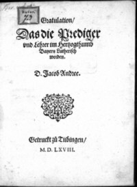 | 19 | Jacob Andreae: Gratulation, das die Prediger und Lehrer im Herzogthumb Bayern Lutherisch worden, Tübingen 1568. |