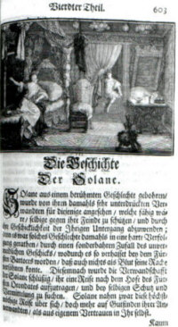 So wird die "Geschichte der Solane" (zur Edition) [2] eingeleitet, eine Binnenerzählung im vierten Band der zweiten Fassung des spätbarocken höfischen Romans "Die Römische Octavia" von Herzog Anton Ulrich von Braunschweig-Wolfenbüttel. Im Rahmen der Romanfiktion ist die hierauf folgende Geschichte selbst, die einem Kranken zur Unterhaltung vorgetragen wird, also bereits als eine schriftlich fixierte, autobiographische Schlüsselerzählung angekündigt, und um eine solche handelt es sich auch in der historischen Wirklichkeit [3]. Verfasst wurde sie nicht vom Romanautor selbst, sondern von einer guten Freundin Anton Ulrichs, der auch ansonsten mit literarischen Werken hervorgetretenen Gräfin Maria Aurora von Königsmarck [4]. Sie hielt sich zum Zeitpunkt der Niederschrift zwar nicht in einem Dianatempel in Dacien auf, doch immerhin im Reichsstift Quedlinburg, wo sie die Stelle einer Pröbstin innehatte. Auch die Behauptung, dass das Manuskript der Verfasserin entwendet und gegen ihren Willen an die Öffentlichkeit gelangt sei, ist kaum für wahr zu nehmen - eine solche Fiktion stellt bei weiblicher Autorschaft im 17. und 18. Jahrhundert einen gern gebrauchten Topos dar.