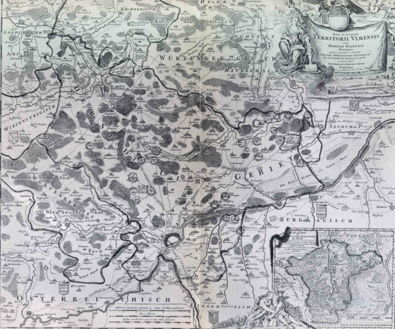 Karte des ulmischen Territoriums von Johann Christoph Lauterbach, 1720 Quelle: Gerold Neusser: Das Territitorium der Reichsstadt Ulm im 18. Jahrhundert. Verwaltungsgeschichtliche Foschungen (= Forschungen zur Geschichte der Stadt Ulm, Bd. 4), Ulm 1964. |