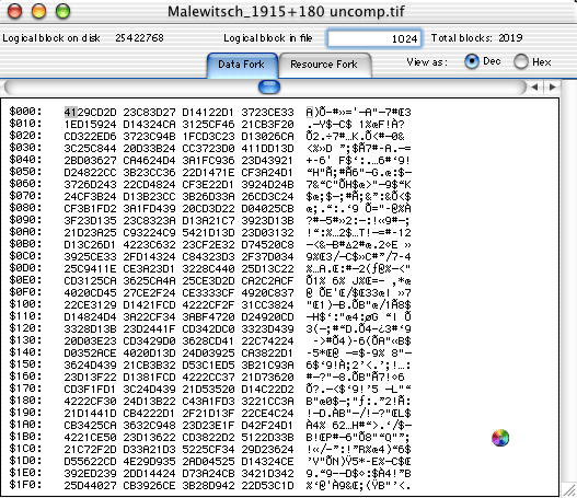 Die hexadezimale Darstellung der Daten eines Scans des "Roten Quadrats".