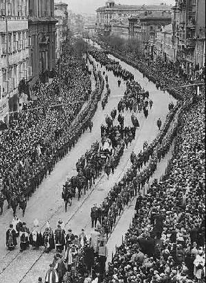 Den 'Regisseuren' des Begräbnisses, den Epigonen Piłsudskis, war klar, dass die Feierlichkeiten über die üblichen Staatsbegräbnisse herausragen müssten: "Das Zeremoniell des Begräbnisses des Marschall Piłsudski soll beispiellos für die Zukunft sein." [10] Insofern wurde mit aller Sorgfalt trotz der kurzen Zeit das Begräbnis geplant. Zunächst wurde der Leichnam Piłsudskis in einem nächtlichen Trauerzug aus dem Belvedere-Palais in die Johannes-Kathedrale in der Altstadt überführt (15.V.1935) und dort aufgebahrt. Die Kirche wurde mit weiß-roten Fahnen und Schützenadler geschmückt. Am 17. Mai fand dann dort der Trauergottesdienst statt, danach führte der Trauerzug, an dem staatliche, gesellschaftliche und kirchliche Würdenträger sowie ausländische Staatsgäste teilnahmen zum Feld von Mokotów, wo die 'letzte Parade' des polnischen Militärs vor Piłsudski stattfand. Danach wurde der Sarg auf einen offenen Waggon geladen und in einer nächtlichen Fahrt über Kielce nach Krakau überführt.