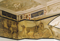 [26] Zum Hirschenfries in Schloss Güstrow vgl. Ralf Weingart: Der Rotwildfries im Güstrower Schloß – Voraussetzungen und Nachfolge, in: Mecklenburgische Jahrbücher 115 (2000), 119-152. Vgl. ferner Bernd Müller: Der Hirschsaal von Schloß Gottorf, in: Gottorf im Glanz des Barock. Kunst und Kultur am Schleswiger Hof 1544-1713, hg. v. Heinz Spielmann / Jan Drees, Schleswig 1997, Bd. 1, 179-186. Weitere Hirschsäle finden sich im dänischen Frederiksborg (1575), in Kronborg (1583/85), in Kalmar (1572/74), in Tondern (1582/85), in Königsberg (1588), und auch im Süden des Reiches, in Weikersheim (1597-1605) sowie in Würzburg (1603/04). Frühere Beispiele, die Güstrow als Muster haben dienen können, gibt es entweder auf dem Gut des dänischen Kanzlers Johann Friis in Hesselagergaard (1540), oder aber in den französischen Schlössern Filain (1550/60) und Chitré (1557). Vgl. ferner Christine Knupp: Jagdfriese in Renaissanceschlössern in Deutschland und Skandinavien, Frankreich und England, Hamburg 1970.