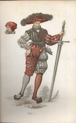Kostümzeichnung aus dem Album Amicorum des niederländischen Studenten Cornelius van der Myle, Sohn Adriaans van der Myle, der als Präsident des Hofes von Holland zum engsten Kreis um Wilhelm von Oranien gehörte. Das seit 1594 geführte Album enthält 162 Eintragungen aus Leiden, Heidelberg, Genf, Saumur, Toulouse, Den Haag und Amsterdam. In dieses Album trugen sich auch die Söhne ostfriesischer Adelsfamilien während ihres Aufenthalts in Genf mit kostbaren Kostümzeichnungen ein.