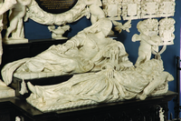 Das Detail aus dem Grabmal zeigt die adlige Auftraggeberin, Anna von Ewsum, als Trauernde - tief dekolletiert und im Nachgewand - über ihrem verstorbenen Gatten Carl Hieronymus zu Inn- und Knyphausen. Mit diesem Grabmal schuf sie ihr Ebenbild in unvergänglicher Jugend und konnte sich als Stifterin und Mäzenin eines der Hauptwerke der nordniederländischen Barockplastik rühmen.