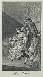 "Die Mutter". Kupferstich, s/w, 132x74 mm, in John Burton: F. Burtons Vorlesungen über weibliche Erziehung und Sitten, aus dem Englischen übersetzt. 2. Band, S. 1, Wien 1799: "Die Mutter. Auf diesem Blatte hat der Künstler eine sorgsame Mutter dargestellt, wie sie die Gesundheit und das körperliche Wohlseyn ihrer Kinder durch fleißiges Reinigen und Säubern zu befördern sucht. Die Sorge, die gewiß sehr wichtig ist, indem sich die Gesundheit des jugendlichen Geistes nur gar zu sichtbar aus der Gesundheit des Körpers zu entwickeln pflegt (...)"