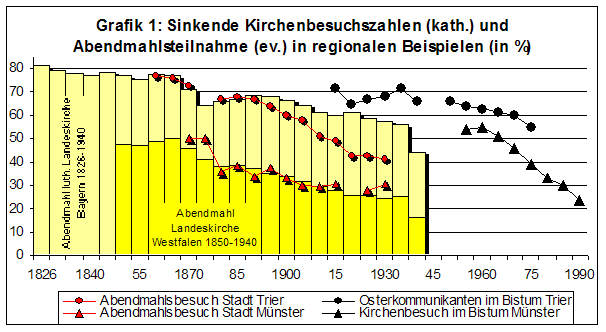 Allgemein vertraut sind Verlaufskurven, die abwärts zeigen, besonders Kirchenbesuchszahlen. Das verlief in allen Regionen ähnlich, allerdings von unterschiedlichen Fallhöhen herab. Bei Protestanten in Bayern wie bei der Diasporagemeinde Triers lag der Anteil der Gemeindemitglieder, die sich 1850 am wenigstens einmal im Jahr gewünschten Abendmahl beteiligten, noch bei fast 80 %. Das war überdurchschnittlich viel, schmolz aber bis 1930 auf die Hälfte herunter. Bei den Katholiken, die systematische Kirchenbesuchsstatistiken erst später erhoben, zeigt sich, dass die Osterkommunionteilnahme in den 1960er-Jahren deutlich sinkt. Im Bistum Trier, dessen Gottesdiensteifer über dem Reichsdurchschnitt lag, wohnten noch im ersten Drittel des 20. Jahrhunderts rund 70 % der Messe bei. Seit Mitte der 1950er-Jahre, verstärkt seit etwa 1968, verfiel das Interesse, im Bistum Münster etwa bis zu gegenwärtig 20 %. [16]