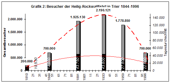 Die erste Grafik, die diese Gesamtkurve vor Augen führt, zeigt die Besucherzahlen bei den letzten sechs Wallfahrten zum Heiligen Rock in Trier. Eingetragen sind die Gesamtbesucherzahl sowie der Tagesdurchschnitt, denn die Ausstellung des Reliquie dauerte unterschiedlich lange, von 19 Tagen (1810) über 44 (1844) bzw. 50 Tage (1891, 1933) bis zu zwei Monaten 1959. 1996 wurden nur noch 31 Tage lang Pilger empfangen. Die spektakuläre Wallfahrt von 1844 übertraf mit geschätzten 500.000 bis 1 Million Pilgern das in jedem Geschichtsbuch zu findende Hambacher Fest (4 Tage, 30.000 Teilnehmer). Sie offenbarte nicht nur die Organisationsfähigkeit der Kirche und die Solidarität ihrer Anhänger. Die Veranstaltung leistete als demonstratio catholica auch "einen wesentlichen Beitrag zur neuerlichen Konfessionalisierung der Bevölkerung". [19] Die Ereignisse 1891 und die umstrittene Massenwallfahrt, die im Juli 1933 eröffnet wurde, ließen den Zustrom ungeheuer anwachsen. Dann sank die Attraktivität dieser Inszenierung.
