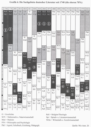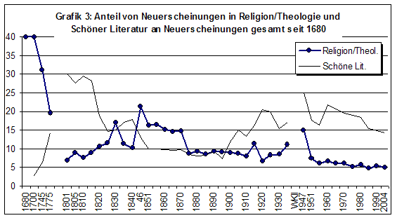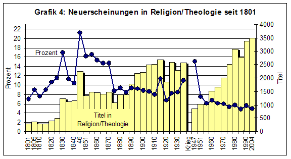 Von 1820 bis 1900 war jedes zehnte Buch ein religiöses. Auf dem Gipfelpunkt der Kurve, in den Jahrzehnten zwischen Vormärz und Reichsgründung, machten sie sogar 15 % der Titelproduktion aus. Religion beschäftigte die Menschen. Dazu kam natürlich, dass die Professionalisierung der Fachtheologie fortschritt. Die Scheidung wissenschaftlicher von erbaulichen Büchern erlauben die Statistiken nicht. Zugleich fanden religiöse Themen Eingang in die Schöne Literatur und andere Publikationsfelder, etwa in die Geschichtsschreibung, die an der religiösen Verbrämung des Nationalismus teilnahm. Grafik 3 jedenfalls zeigt, dass die Kurven von Theologie und Dichtung im 18. und 19. Jahrhundert gegenläufig, im späten 20. Jahrhundert indes teils parallel zueinander verlaufen, was Spekulationen darüber zulässt, ob die Schöne Literatur damals als mit Religion konkurrierendes, in der Zeitgeschichte aber als ein zur Religion komplementäres Sinndeutungsgenre fungiert.