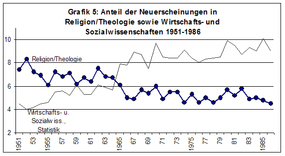 Der Höhenflug der Religion über den Buchmarkt endete in den 1960er-Jahren. Schon mit dem anhebenden Wirtschaftwunder ließ das Interesse an religiöser Literatur nach. 1952 erreichte sie noch mehr als 8 %. Doch dann setzte sie 1955 hart auf und landete nach 150 Jahren das erste Mal dort wieder, wo sie zuletzt 1800 gestartet war, nämlich bei gut 6 %. Zwar erholte sie sich noch einige Male leicht. Doch seit 1965 kam sie nicht wieder über 6 %. In schlechten Jahren musste sie einen Rückgang auf 4,5 % beklagen. Die Gewinner der 1960er-Jahre waren andere, besonders die Wirtschafts- und Sozialwissenschaften, die daher als Kontrastlinie in die Nahaufnahme der Jahre 1951 bis 1986 (Grafik 5) aufgenommen wurden.