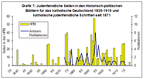 Die gezeigten Kurven spiegeln eher religiöse denn konfessionalistische Phänomene, solange die Zahl konfessionsverhetzender Schriften innerhalb der religiösen Literatur unbekannt bleibt. Konfessions- oder Rassenhass lässt sich schlecht in Zahlen fassen. Dennoch gibt die Auszählung von Publikationen und Seiten der seit 1835 bestehenden Historisch-politischen Blätter für das katholische Deutschland einen Anhaltspunkt dafür, wie die Phasen des katholischen Antisemitismus verliefen, der im Kulturkampf und um 1900 zunahm. [31]