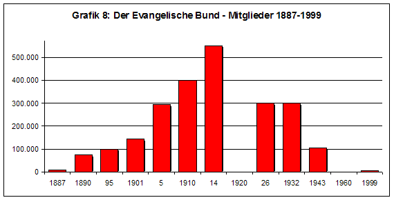 [32] Armin Müller-Dreier: Konfession und Politik, Gesellschaft und Kultur des Kaiserreichs. Der Evangelische Bund 1886-1914, Gütersloh 1998, 333, Zahlen für Grafik 8: 80; Zahlen für 1926, 1932, 1943, 1999: Walter Fleischmann-Bisten: Evangelischer Bund, in: RGG, Bd. 2, 1999, 1728-31.