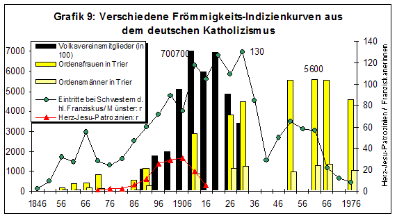 Eine kleine Sammlung weiterer Kurven und Daten in Grafik 9 zeigt, wie unterschiedlich die Verlaufsformen einzelner Phänomene waren, aber auch, wie sich die entscheidenden Phasen, besonders der Abschwung in den 1960er-Jahren, mit der Parabel vom zweiten konfessionellen Zeitalter decken. Die Gründungen von Herz-Jesu-Patrozinien in fünf Diözesen häuften sich um 1900. Das Vereinswesen boomt erst im späten Kaiserreich. Der 1891 gegründete Volksverein für das katholische Deutschland, der 1914 über 805.000 Mitglieder fasste, schrumpfte in den 1920er-Jahren und wurde 1933 aufgelöst. Indes wuchs die Zahl von Frauen und Männern in Orden des Bistums Tier weiter, sogar bis in die 1960er-Jahre, als auch die Eintritte bei den Schwestern des heiligen Franziskus in Münster zurückgingen. [33]