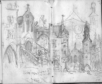 Nach seiner Ankunft in München unternahm Jan Matejko zusammen mit seinem Freund Jabłonski zahlreiche Stadtbesichtigungen (Abb. 4), wobei er anfänglich die gleichen Sehenswürdigkeiten wie jeder gewöhnliche Tourist auch besuchte: [7] so beispielsweise die Residenz mit ihren Fresken unter den königlichen Garten-Arkaden, die ihn beeindruckten. Diese Gemälde haben zwar keinen sonderlich hohen künstlerischen Wert, doch schätzte Matejko sie, weil sie Szenen aus der bayerischen Geschichte abbildeten. Für ihn war jede Darstellung mit historischer Thematik von großer Bedeutung, weswegen er vor allem auch die historische Architektur in den alten Stadtteilen Münchens skizzierte (Abb. 5). [8] Die neuen Münchener Gebäude interessierten ihn dagegen offensichtlich weniger, doch besuchte er auch sie.