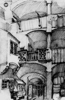 Jan Matejko, Der Hofraum des ehemaligen Schlafhaubenkrämers, 1859, Zeichnung, 29 x 19,7 cm, Krakau, Muzeum Narodowe w Krakowie-Dom Jana Matejki, Inv. Nr. IX/414