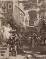 Die Gemälde von Delaroche und Piloty sind spannungsgeladen und zeigen dramatische, oft blutige Ereignisse. Sie machten auf Matejko, der sie während seiner Zeit in München sah, großen Eindruck, selbst wenn er manche von ihnen nur als Reproduktionen zu Gesicht bekam. Während seines Aufenthaltes in Bayern begann er im Geiste dieser Vorbilder mit dem Gemälde 'Die Vergiftung von Bona' und erweiterte damit sein Repertoire um die Todes-Thematik am Beispiel einer berühmten Persönlichkeit. Weiter hervorzuheben sind später 'Zborowski wird zur Hinrichtung abgeführt' (1860), 'Der Mord an Wapowski bei der Krönung Heinrichs von Valois' (1861) und 'Jan Kochanowski mit seiner Tochter Ursula' (1862) (Abb. 8). [24] Großes Pathos nach dem Vorbild Kaulbachs prägt dann die riesigen, vielfigurigen Szenen, welche nach seiner Rückkehr aus München entstanden sind. Genannt sei hier in erster Linie 'Skargas Predigt' (1864) und 'Rejtan – Polens Untergang' (1866) (Abb. 9). [25]
