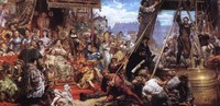 Meiner Meinung nach könnten eben gerade diese Gemälde Kaulbachs Matejko dazu angeregt haben, seine eigenen Lösungen in der Darstellung wichtiger und maßgeblicher historischer Ereignisse zu finden und sein eigenes künstlerisches Konzept zu entwickeln, das eben, was in der Matejko-Rezeption seine 'Historiosophie' genannt wird. Die Komposition nämlich hatte als eine Zusammenschau von mehreren Ereignissen zu gelten – einige gehen dem Ereignis voraus, andere folgen ihm. In diesem Sinne fügte Matejko der Komposition auch Personen ein, die ursprünglich nicht an dem dargestellten Ereignis teilnahmen, es aber beeinflusst haben könnten. Das erste große Gemälde dieses Typs, 'Skargas Predigt', beendete der Künstler 1864, [28] allerdings muss das Konzept für dieses Bild früher entstanden sein und zwar nicht lange nach Matejkos Rückkehr aus München. Die erste Ölskizze stellte er nämlich bereits um 1861 fertig. [29]