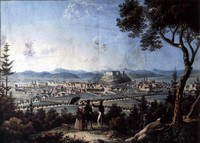 Alois Schaffenrath, Ansicht Ljubljanas vom Rožnik, um 1820, kolorierte Lithographie, 23 x 32 cm, Mestni muzej, Ljubljana, Inv. Nr. 1575