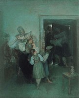 Vesel ist übrigens eine sehr interessante Persönlichkeit, [25]weil sein Werk wie ein Abbild einer für München typischen künstlerischen Entwicklung erscheint, angefangen mit seinen Kopfstudien, wie zum Beispiel dem 'Kopf eines weißhaarigen alten Mannes' (1887, Abb. 11) in der malerischen Manier seines Lehrers Ludwig von Löfftz, bis zum 'Porträt von Josip Niko Sadnikar' aus demselben Jahr (Abb. 12), das bereits deutlich die Nähe zum Leibl-Kreis zeigt. Ähnlich wie bei Kobilca hat die Freilichtmalerei beziehungsweise der so genannte Atelierpleinairismus seine Gemälde aufgelockert und seine Palette aufgehellt; typisch dafür sind Interieurs wie zum Beispiel 'Blinde Kuh' (1891, Abb. 13), die deutlich Einflüsse Fritz von Uhdes spüren lassen. Nachdem er sich mit Rihard Jakopič, einem der so genannten Slowenischen Impressionisten, angefreundet hatte, begann auch er mit der richtigen Freilichtmalerei – die beiden malten zusammen in Schwabing und im Englischen Garten. Schließlich ging er von der Freilichtmalerei zur Stimmungsmalerei des Symbolismus über. Seine Werke weisen auch Einflüsse der Münchener Sezession auf, was sich in mehr persönlichen und farblich intensiveren Lösungen manifestiert.