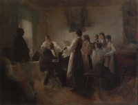 In diese Zeit fällt das Bild 'Vor der Hochzeit' (1897, Abb. 14), ein Werk, das von Gemälden des wohl einflussreichsten und bei dem Gründerzeitpublikum sehr beliebten Münchener Genremalers Franz von Defregger (1835-1921) angeregt sein könnte. Defreggers berühmte Tiroler Bauernbilder wurden zum Vorbild für seine Schüler an der Akademie wie auch für seine Nachahmer, denn das idealisierte Leben der Bauern voller Ursprünglichkeit und Sorgenlosigkeit war für das Bürgertum dieser Zeit ein Abbild ihrer Sehnsucht nach einem harmonischen Leben anstelle der schalen Existenz in der Stadt. Dieses Sujet des idealisierten Landlebens pflegten viele Maler im 19. Jahrhundert, von Heinrich Bürkel bis Waldmüller über Gauermann, um nur einige zu nennen. Von den Zeitgenossen wurde als Qualität dieser Maler und als Grund für ihren Erfolg beim Publikum die Volkstümlichkeit ihrer Bilder hervorgehoben [26], die auch in Vesels Gemälden spürbar ist und die in Slowenien Gefallen fand. Unmittelbares Vorbild für Vesels Genrebild war wahrscheinlich Defreggers Gemälde 'Der Abschied', [27] das Vesel im selben Jahr, als sein Bild entstand, auf der 'Internationalen Kunstausstellung' im Glaspalast in München sehen konnte. [28] In seiner Malweise entspricht es zwar nicht der Defreggerschen realistischen Genauigkeit, aber das Thema und die Gestaltung des Raumes erinnern an dieses Werk, obwohl auch andere Bilder aus Defreggers umfangreichen und berühmten Œuvre [29] Vesel als Anregung gedient haben könnte.