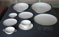 Dieses eigens für den Preußischen Staatsrat angefertigte Service könnte man als eine weitere Bemühung Görings deuten, ein zeitgenössisches Zeichen in der Atmosphäre des vergangenen Königtums zu setzen. Sie würde sich in die bereits beschriebenen Initiativen in diese Richtung einreihen. Jedoch erstaunt die Ausführung dieses Wunsches: Das schlichte Service “Urbino“ der Gestalterin Trude Petri scheint nicht zu den pompösen Machtgesten Görings zu passen. “Urbino“ ist ein einfach gestaltetes Service (Trude Petri führte es auf eine simple Kugelform zurück), das, in einem zarten Eierschalton gehalten, lediglich durch einen Streifen in dem in den 1930er Jahren sehr beliebten blassen Seladon-Grünton “verziert“ ist. Das schlichte Porzellan setzte sicher auf den Festtafeln im Anschluss an die Sitzungen im Neuen Palais einen sehr besonderen Akzent.