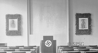 Für die Identitätsbildung der “Reichsarbeitsdienstschüler“ im Sinne des nationalsozialistischen Arbeitsdienstes schien es den Initiatoren jedoch von außerordentlicher Bedeutung zu sein, die künftigen Reichsarbeitsdienstlehrer der Bezirksschulen mit dem täglichen Blick auf den letzten großen Schlossbau Friedrichs II. zu unterrichten. Darüber hinaus ließ man in dem im Südcommun untergebrachten Vortragsraum der Reichsschule neben dem Rednerpult ein zeitgenössisches Bildnis des Königs anbringen - auf gleicher Höhe mit dem Bild Adolf Hitlers, im gleichen Format und im gleichen Stil.