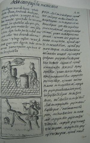 Diese Kritik trifft den Florentiner Codex und gerade auch das Buch XII, welches die Eroberung Mexikos aus Sicht der Mexica erzählt, in besonderer Weise. Denn der Codex bedient sich nicht nur der europäischen Schriftform, in Nahuatl und Spanisch, sondern verwendet auch Bilder. Aber in Buch XII sind es noch viel mehr die Bilder als der eigentliche Text, die den “kolonialen Akt“ sichtbar werden lassen. Sie haben mit der Funktion von Bildern im indigenen bildschriftlichen Medium kaum noch etwas gemein. Der mediale Wandel durch die europäische alphabetische Schriftlichkeit transformiert auch die Bilder. Im Florentiner Codex entsprechen die Bilder eher europäischen Bildkonventionen. Für den französischen Historiker Serge Gruzinski scheinen sie sogar, anders als der Text, die spanische Sichtweise zu favorisieren. [13]