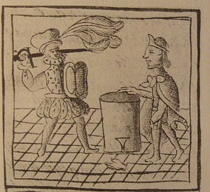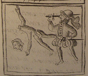 Das Massaker beginnt mit dem Moment, als die Spanier den Trommler angreifen (Abb. 11). Es zeigt einen Spanier, der ein Schwert in der erhobenen rechten Hand führt. Er trägt einen großen Hut mit einem sehr großen Federbusch. In der Linken hält er einen Schild. Er geht mit seinem über dem Kopf erhobenen Schwert zum Schlag ausholend auf einen Mann zu, der an einer Trommel steht. Dieser, durch seine Kleidung als Adliger ausgewiesener Mexica, legt die rechte Hand auf die Trommel. Der Mund ist leicht geöffnet und sein linker Arm hängt herab. Die Hand des Arms wurde abgeschlagen, sie liegt links neben der Trommel. Ein Gittermuster auf dem Boden vermittelt Raumwirkung. Das gilt auch für die Trommel, die dreidimensional dargestellt ist.