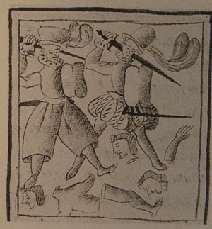 Das Bild (Abb. 13) zeigt uns zerstückelte Mexica auf dem Boden liegend, drei Köpfe, ein Rumpf ohne Kopf, Arme und Beine, ein abgeschlagenes Bein und einen Arm. Über den zerstückelten Mexica schweben, fast tänzerisch, zwei Spanier. Beide führen den rechten Arm mit dem Schwert in der Hand zum Schlag ausholend. In der linken Hand halten sie einen Schild. Auch sie sind wiederum anders gekleidet als die beiden Spanier auf den Bildern zuvor. Sie unterscheiden sich auch untereinander durch unterschiedliche Beinkleider und Hüte. Auffallend ist auch hier der große Federschmuck. In der Darstellung des Geschehens scheinen die Gesetze von Raum und Zeit außer Kraft gesetzt.