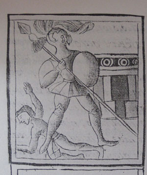 Ein ganz andere Aufmachung weist der Spanier in diesem Bild (Abb. 14) auf: Hier wird ein Ritter mit geschlossenem Visier, Schild und langem Speer gezeigt. Unter ihm liegt oder kriecht ein niedergesunkener Mexica. Im Hintergrund wird der Eingang des Palastes gezeigt.