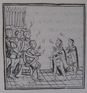Acht Jahre nach der Niederlage, im Jahr 1529, reist der etwa dreißig Jahre alte Franziskaner Fray Bernardino de Sahagún (1499-1590) nach Mexiko. Aus dem Werk, das maßgeblich mit seinem Namen verbunden ist, der Historia general de las cosas de la Nueva España, erfahren wir die von Sahagún aufgezeichnete indigene Version von der Kapitulation Quauhtemocs. Der siegreiche Conquistador Cortés erzählt uns hingegen eine andere Geschichte. In seiner Schilderung vom Ende des Krieges versucht Quauhtemoc zu fliehen und wird dabei von den Spaniern gefangen genommen: keine Kapitulation, sondern eine schmachvolle Flucht und damit ein unrühmliches Ende, so stellt er es in seinem Bericht dar. In Sahagúns Werk jedoch kommen die Mexica selbst zu Wort: Sie schreiben ihre Geschichte in ihrer eigenen Sprache, dem Nahuatl. [1]