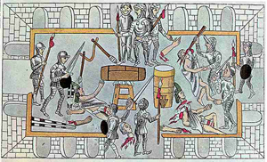 Das Bild (Abb. 16) zeigt den Tempelinnenhof mit seinen vier Ausgängen, an denen jeweils Spanier postiert sind. Die Spanier tragen Rüstungen und Helme. Sie sind mit Lanzen und Schwertern bewaffnet. In der Mitte stehen zwei rituelle Trommeln und die Spanier werden gezeigt, wie sie die Mexica töten. Zu sehen sind die zerstückelten Körper und die abgeschlagenen Gliedmaßen und Köpfe. Ein Spanier sticht gerade einem Mexica mit der Lanze ins Gesicht: Überall spritzt Blut.