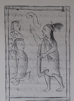 In diesem Bild treten die Einflüsse traditioneller Bildsprache deutlich hervor: Insbesondere die Mexica im linken Bildbereich entsprechen den schablonenhaften Bildkonventionen von Herrscherdarstellungen in altmexikanischen Manuskripten. Das gilt auch für den fehlenden Raumbezug, die Suggestion des Schwebens und die seitliche Darstellungsweise. Ein klassisches Symbol bildschriftlicher Ausdrucksweise ist die stilisierte Zunge: Sie steht für Laut oder Rede. Die Figur des stehenden Mexica hingegen zeigt durch ihre mehr naturalistische Darstellung den europäischen Einfluss.