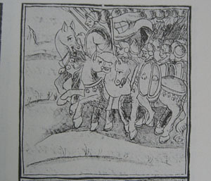 Ein Beispiel für eine europäisch wirkende Darstellung zeigt die spanischen Conquistadoren (Abb. 3). Zu sehen ist ein berittener spanischer Bannerträger in einer angedeuteten Landschaft mit Hügeln im Hintergrund. Rechts am Bildrand sehen wir weitere Spanier auf Pferden mit ihren Schilden, den Lanzen und den typischen Helmen. Schattierungen verleihen dem Bild Tiefe und ansatzweise ist eine Zentralperspektive erkennbar.