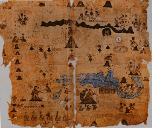 Das folgende Bild zeigt im Kontrast dazu eine bildschriftliche Geschichte (Abb. 4). Elizabeth H. Boone unterscheidet hier zwei Arten bildschriftlicher Geschichtsschreibung: einmal die geographische, die wir hier sehen, und dann die uns vertrautere chronologische, in der Ereignisse zeitlich linear dargestellt werden. [14]