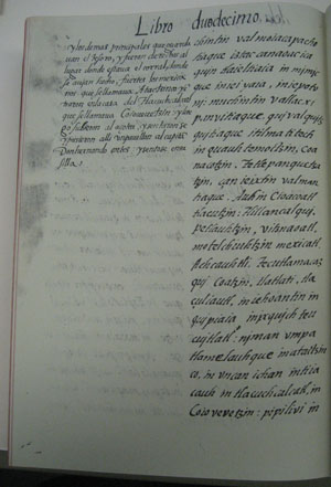 Sahagúns Projekt, die alte Welt der Nahuas zu erfassen, bedient sich der indigenen Sprache Nahuatl, gleichzeitig aber wird sie in ein für die Nahuas neues Medium übertragen, die alphabetische Schrift mit lateinischen Buchstaben. Diese Form Nahuatl zu schreiben, ist ein koloniales Produkt. Denn in der Zeit vor der Eroberung zeichneten die Nahuas ihr Wissen noch mithilfe eines piktographischen Schreibsystems auf. Schon im 16. Jahrhundert gibt es Diskussionen darüber, inwieweit diese Bildschriftlichkeit als Schrift verstanden werden kann; eine Diskussion, die bis heute geführt wird, wobei insbesondere jüngere Publikationen für einen weitgefassten Schriftbegriff plädieren, der auch die Bildschrift als Schriftlichkeit anerkennt. [9]