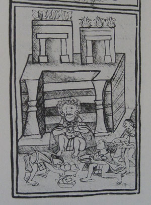 Am Fuß des Tempels ist eine sitzende und geschmückte Figur zu sehen. Es ist die Statue Huitzilopochtlis. Dem Text zufolge soll der Körper aus Teig bestehen, der um Stöcke herum geformt wurde. Die Statue Huitzilopochtlis trägt ein spezielles Hemd für die Zeremonie, das mit Totenköpfen und Knochen bedeckt ist (Abb. 10). Ihm zu Füßen, deutlich kleiner, bringen drei Mexica verschiedene Opfergaben dar.