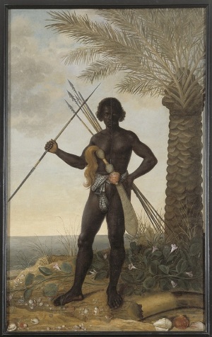 In Spanisch-Amerika und Europa gilt diese Zeit als Barock; der atlantische Raum der Neuzeit harrt noch eigener Chronologie und Epochenkonventionen. In der Realität waren Sklaven, Sklavenhandel und Sklavereien sowie Widerstand gegen Versklavung ubiquitär. [6] In Texten allerdings war all dies weitgehend abwesend. Der schwerbewaffnete Schwarze in Brasilien von Albert Eckhout (Abb. 1) ist eine Ausnahme, die mit den Kämpfen um die Dominanz über den Sklaverei-Atlantik zusammenhängt (vor allem zwischen Portugal/Brasilien und den Niederlanden zu beiden Seiten des Ozeans, deshalb auch die deutlichen Bezüge zu Afrika (Elfenbein, Wurfspeere, Krummsäbel)). Bis um 1790 gab es extrem starke Konventionen der Darstellung von Sklaven, die alle entweder von der Struktur (engenho/ingenio = Plantage und Zuckermühle), dem Exotismus von Landschaften oder Darstellungen leidender Menschen, mit wenigen Variationen, geprägt war.