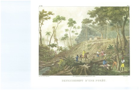 Weitere Arbeiten von Sklaven auf dem Land sind in einer Bildfolge zur ruralen Sklaverei wiedergegeben (Urbarmachung durch Baumfällen, Zuckermühle, Kaffeeernte, Herstellung von Mandioca und Sklavenhütte).