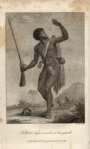 [7] „A Rebel negro armed & on his guard“, in: John Gabriel Stedman: Narrative of a five years’ expedition, against the Revolted Negroes of Surinam, in Guiana, on the Wild Coast of South America; from the year 1772, to 1777, elucidating the History of that Country, and describing its Productions. Viz. Quadrupedes, Birds, Fishes, Reptiles, Trees, Shrubs, Fruits, & Roots; with an account of the Indians of Guiana, & Negroes of Guinea. By Captn. J. G. Stedman, 2 Vols., London. Printed for J. Johnson, St. Paul’s Church Yard & Th. Payne, Pall Mall, 1806 (second edition, corrected), Vol. II, gegenüber 91 (Stecher: Francesco Bartolozzi).