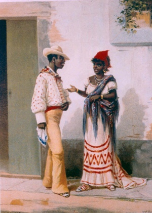 Im Kostumbrismus akzeptierten die Sklavereieliten Darstellungen des Karnevals (vor allem Miahle). Die Angst vor Widerstand und `Chaos´ verhinderte die Darstellung etwa von waffenlosen Kampftechniken der Sklaven und freien Farbigen (außer im brasilianischen Bildregister, zum Beispiel in Rugendas’ Bild “Jogar Capoera“ Abb. 41 unten). Dazu kam der starke Einfluss US-amerikanischer Kultur ab 1898, der einerseits zum realen Abbrechen vieler populärer Kulturelemente auf Kuba (wie etwa des Sklaven-Kampfsportes `maní´– ein Kreiskampftanz mit Ursprung wohl im Gebiet zwischen Liberia und Kamerun), andererseits zu einer starken Durchwucherung einer verborgenen Volksfrömmigkeit, die Kuba eine führende Stellung in der `santería ´und anderen populären Religionen sichert - allerdings bis heute eher im Bereich des Verborgenen und Informellen sowie ohne formale bildliche Repräsentanz. [31]