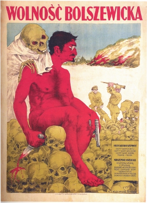 Komplementär dazu die Situation auf polnischer Seite: Hier konnten die Akteure in den diversen Propaganda-Abteilungen auf den oben beschriebenen common sense im Verständnis von Judentum und Bolschewismus rekurrieren. Eine aufwändige Propaganda-Offensive wurde damals gestartet, parallel zur gesellschaftlichen Mobilisierung. Verschiedene Organisationen befassten sich in dieser Phase parallel mit antisowjetischer Propaganda, [57] zu denen als wichtigste gehörten: die Propaganda-Abteilung beim Generalstab der regulären Armee, [58] die Stabsstelle Propaganda beim Generalinspektor der Freiwilligen-Armee, [59] die Propaganda-Abteilung im Armee-Ministerium, [60] sowie das Zentrale Propagandakomitee, in dem bedeutende Grafiker, Maler und andere Künstler mitarbeiteten. [61]