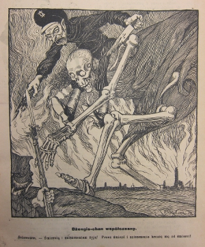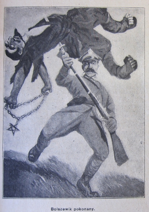 Hinzu kamen Karikaturen in der Tagespresse und in Satiremagazinen. Sie waren recht unterschiedlicher Natur – ein Gegensatz, der auch von den Zeitgenossen wahrgenommen wurde. So machte schon Władysław Wankie einen Grundsatzstreit darüber aus, ob man die Bol'ševiki als große, feindliche Macht, schrecklich und bedrohlich, darstellen solle oder aber geringschätzig, als "Bande von Schurken und Betrügern". [64] Und er kam zu dem Schluss, dass beides seine Berechtigung habe: