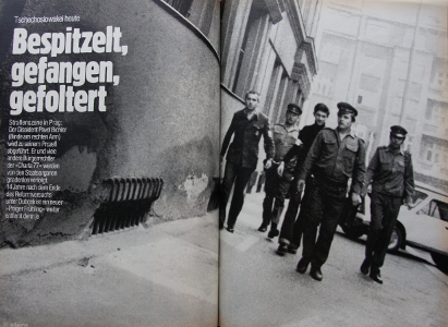 Den Einstieg in die Reportage bildet eine Straßenszene aus Prag, die im Format einer Doppelseite wiedergegeben ist (Abb. 1). Eingeführt mit der Überschrift "Tschechoslowakei heute. Bespitzelt, gefangen, gefoltert" erfährt der Leser, dass es sich hier um den "Dissidenten Pavel Bichler" [korrekt: Büchler, H.H.] handle, der zu seinem Prozess abgeführt werde. Er werde, wie viele Bürgerrechtler der Charta 77, "von den Staatsorganen gnadenlos verfolgt". [13] In Handschellen und an einen anderen Gefangenen gefesselt, eskortieren ihn drei uniformierte Polizisten auf dem Weg zur Gerichtsverhandlung. Als einziger der fünfköpfigen, geradewegs auf das Objektiv des Fotografen zulaufenden Personengruppe, blickt Büchler freundlich in Richtung der Kamera. Er erkennt nicht nur seine Mutter und eine Bekannte auf dem Bürgersteig, sondern auch Ivan Kyncl und dessen Absicht, die Szene zu fotografieren. [14] Die Frauen bieten dem Fotografen auf offener Straße die notwendige Deckung, so dass Kyncl die Repräsentanten der staatlichen Ordnung und ihre "Opfer" frontal ins Visier nehmen kann.