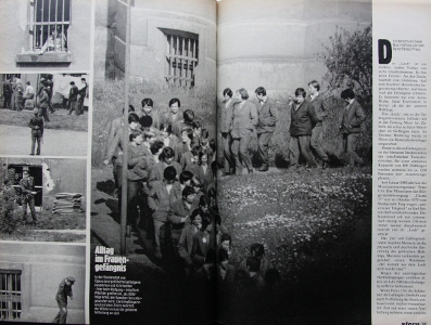 Die dritte Doppelseite der Fotoreportage erlaubt unter der Bildüberschrift "Alltag im Frauengefängnis" einen Blick in den Innenhof einer Strafanstalt (Abb. 4). [22] Im Zentrum der Doppelseite steht wiederum ein großformatiges Einzelbild. Es zeigt eine Gruppe von weiblichen Gefangenen. Sie sind uniform mit grauen Häftlingsanzügen bekleidet und absolvieren bei sonnigem Wetter den vorgeschriebenen Rundgang im Innenhof. Am rechten Rand der Doppelseite beginnt der Bericht Dieter Bubs; am linken Rand befindet sich eine Bildserie, die aus vier vertikal angeordneten kleinformatigen Fotografien besteht. In der Leserichtung von oben nach unten stellen sie laut Bildkommentar den Abwurf eines Kassibers dar: "Die Empfängerin wird mit dem Stock bedroht, der Wärter nimmt die geheime Mitteilung an sich." [23]