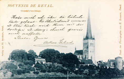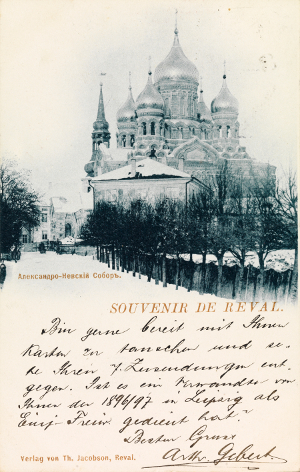 Auf Anfrage Fellers hin antwortete sein Kontaktmann in Reval, Arthur Gebert (über den nichts weiter bekannt ist): "Bin gerne bereit mit ihnen Karten zu tauschen und sehe ihren z[ukünftigen?]. Zusendungen entgegen. […]" [13] Als Motiv hatte Gebert die Aleksandr-Nevskij-Kathedrale gewählt, die auf dem zentralen Hügel, dem Domberg, in Reval thront und zu diesem Zeitpunkt noch nicht ganz vollendet war (Abb. 1, Bauzeit 1895 bis 1900, Weihe am 30. April 1900). Der Baukörper erhebt sich rechts neben einer diagonal verlaufenden Straße hinter kleinen Bäumen. Ein Gebäude verdeckt die unteren Teile der Kirche, die Türme mit ihren Hauben sind deutlich zu sehen. Schnee bedeckt Straßen und Dächer. Die Fotografie der Postkarte war recht aktuell, wohl erst Winter 1898/99 aufgenommen worden. Es lässt sich noch der Bauzaun ausmachen. Zweifellos war für Gebert ausschlaggebend gewesen, eine Aufnahme des neuesten und spektakulärsten Bauwerks in Reval, das zudem auch noch als Symbol einer Russifizierung gelten konnte, an Feller zu senden, waren die Esten doch protestantisch, wenngleich sich unter ihnen auch bedeutende Minderheiten anderer Konfessionen fanden.